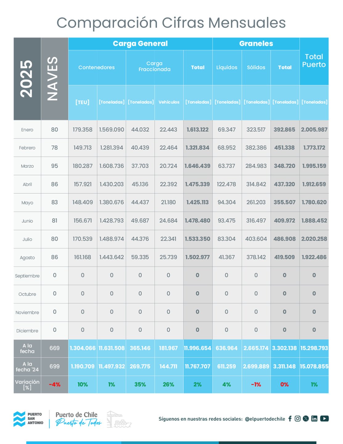 En carga fraccionada, el puerto alcanzó 440.943 toneladas, mientras que en granel sólido el movimiento llegó a 4.209.539 toneladas, y el granel líquido cerró con 959.407 toneladas.