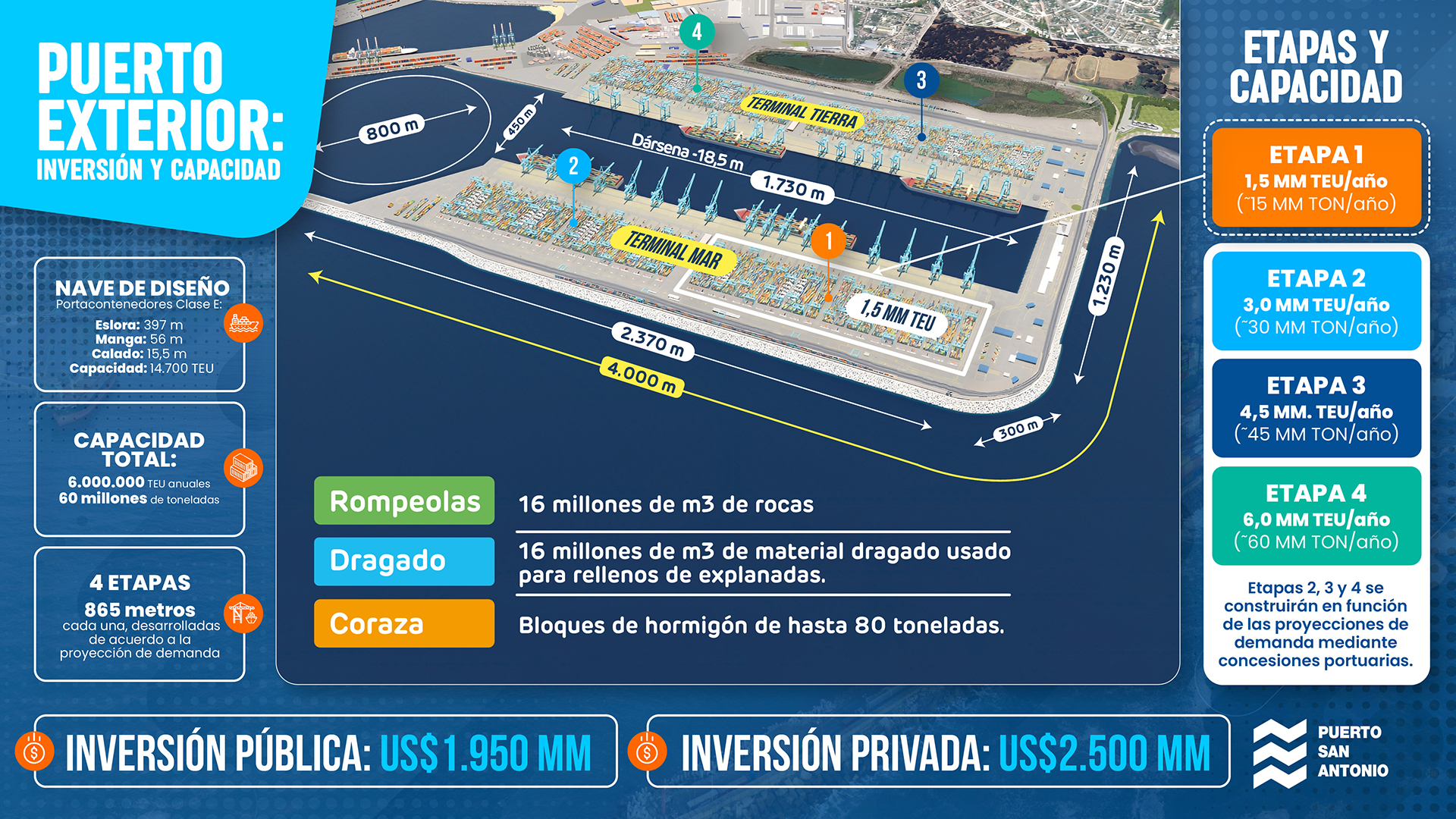 El plan integral de inversión se estima en USD 4.450 millones; de los cuales USD 1.950 millones serán aportados por la Empresa Portuaria San Antonio para la construcción de las obras de abrigo, la generación de la dársena, áreas de respaldo y vías de acceso, además de las medidas de mitigación y compensación ambiental. Los restantes USD 2.500 millones serán aportados por el sector privado, mediante concesiones portuarias, para la construcción, habilitación y operación de los sitios.